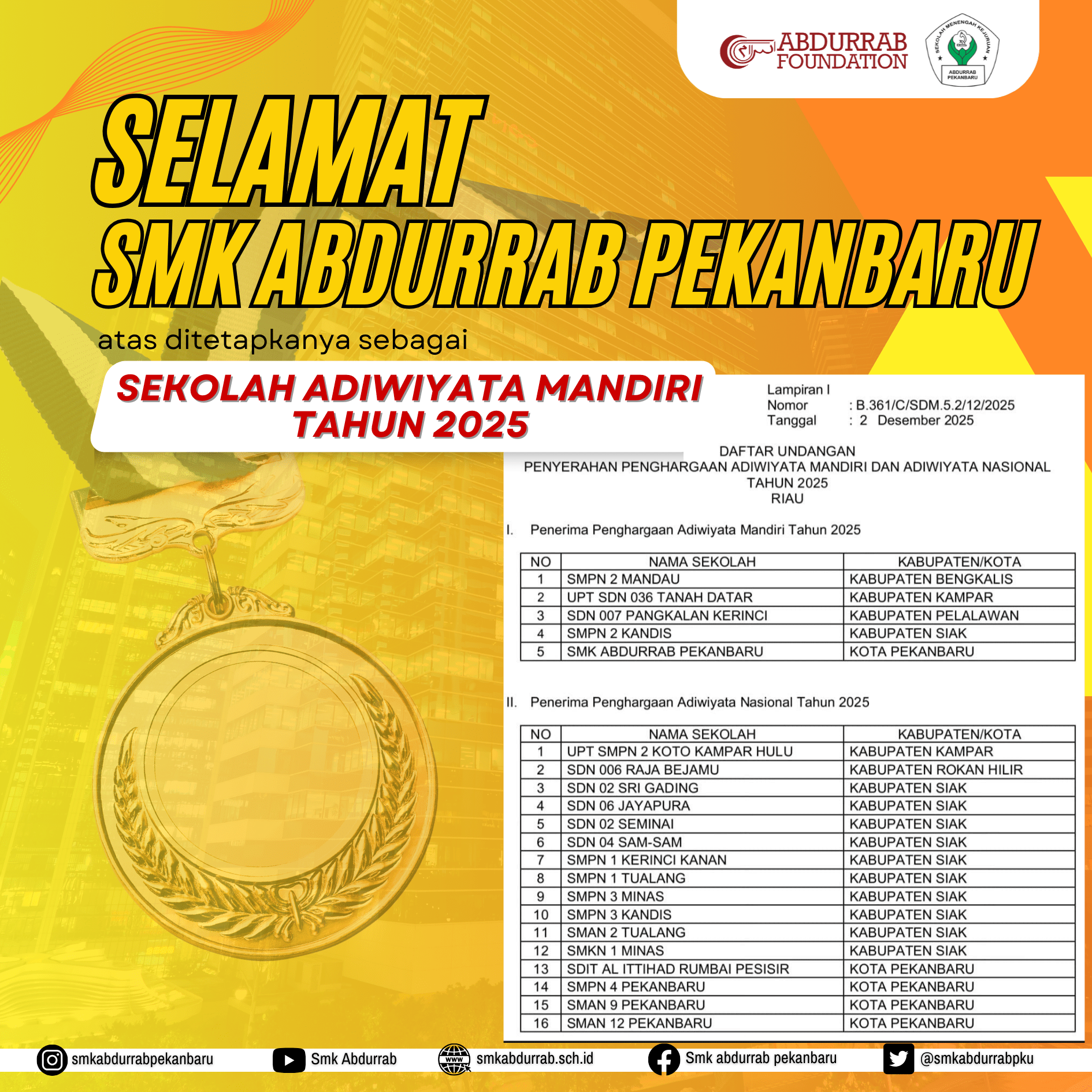 Sekolah Adiwiyata Mandiri Dengan penuh rasa syukur, kami mengucapkan terima kasih yang sebesar-besarnya atas diraihnya Penghargaan Adiwiyata Mandiri Tahun 2025 oleh SMK Abdurrab Pekanbaru. Prestasi ini tentu tidak terlepas dari dukungan, bimbingan, dan kerja sama berbagai pihak yang selama ini berperan dalam mewujudkan sekolah yang berbudaya lingkungan.